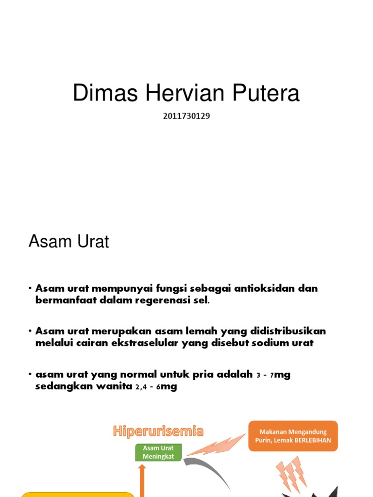 Penyakit asam urat adalah penyakit yang disebabkan penumpukan kadar purin dalam tubuh yang berlebihan. penumpukan ini bisa disebabkan karena konsumsi makanan yang memiliki banyak kandungan purin tinggi. jika kondisi kadar asam urat dalam tubuh cukup tinggi, selanjutnya akan berdampak juga pada kinerja ginjal sehingga tidak mampu mengeluarkan zat purin tersebut melalui saluran urin.